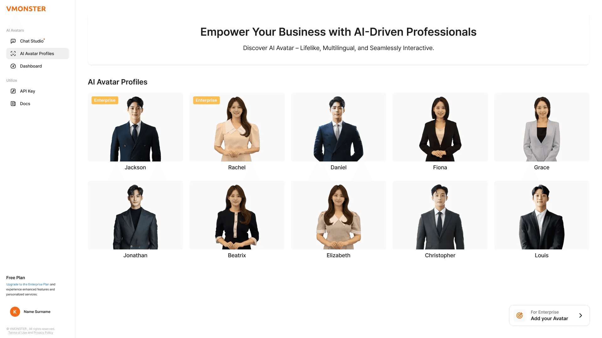 AI Avatar Profiles는 브이몬스터가 제공하는 다양한 AI 아바타들을 직접 듣고, 보고, 비교해볼 수 있는 공간입니다.