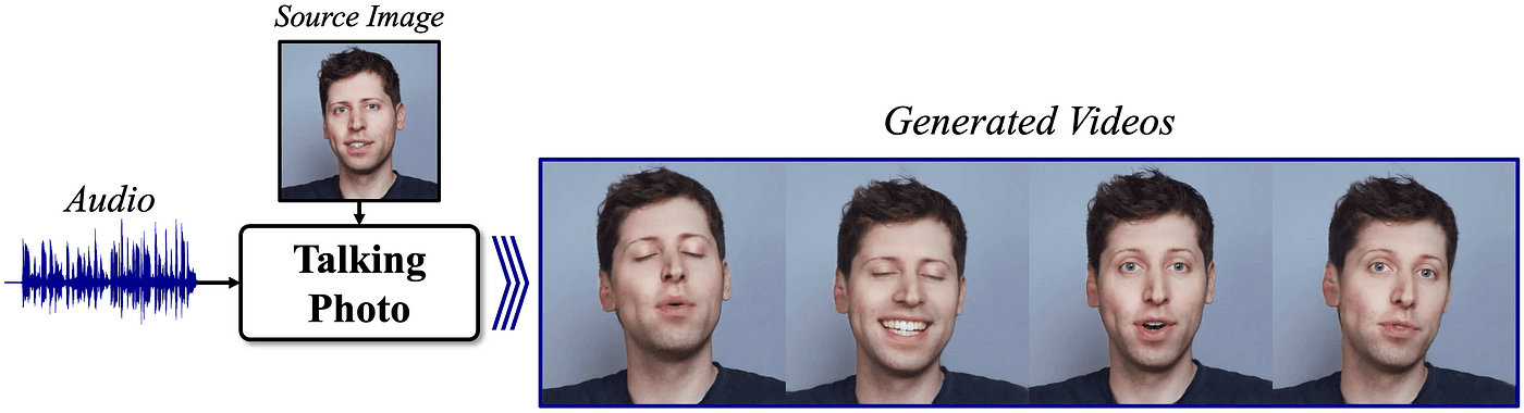 <토킹포토 (Talking Photo) 기술 개요도. 얼굴 사진 (Source Image)과 음성 (Audio)로 말하는 영상 생성>