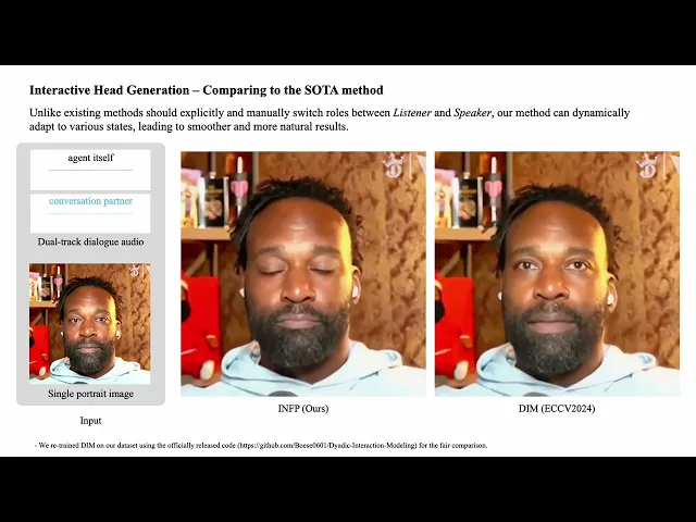 반응형 토킹 포토는 사용자의 말에 반응하는 AI 기술을 지칭합니다. 이러한 기술을 이용했을 때, 실제 사용자가 AI 아바타와의 대화에서 더 높은 사용자 경험을 얻지 않을까요? 지금까지의 토킹 포토 기술을 “speaking” photo 라고 한다면, 이 반응형 토킹 포토는 “listening” photo 기술까지 접목된 기술이라고 볼 수 있습니다. 가장 대표적인 최신 연구인 INFP (CVPR 2025) 는 “본인이 말하는 음성”과 “본인이 아닌 다른 사람이 말하는 음성”을 처리하는 각각의 memory network를 두어, 립싱킹 같은 화자의 움직임 (speaking motion)과 고개 끄덕임, 맞장구 같은 청자의 움직임 (listening motion)을 모두 인식하며 움직이는 토킹포토 기술을 제안했습니다.