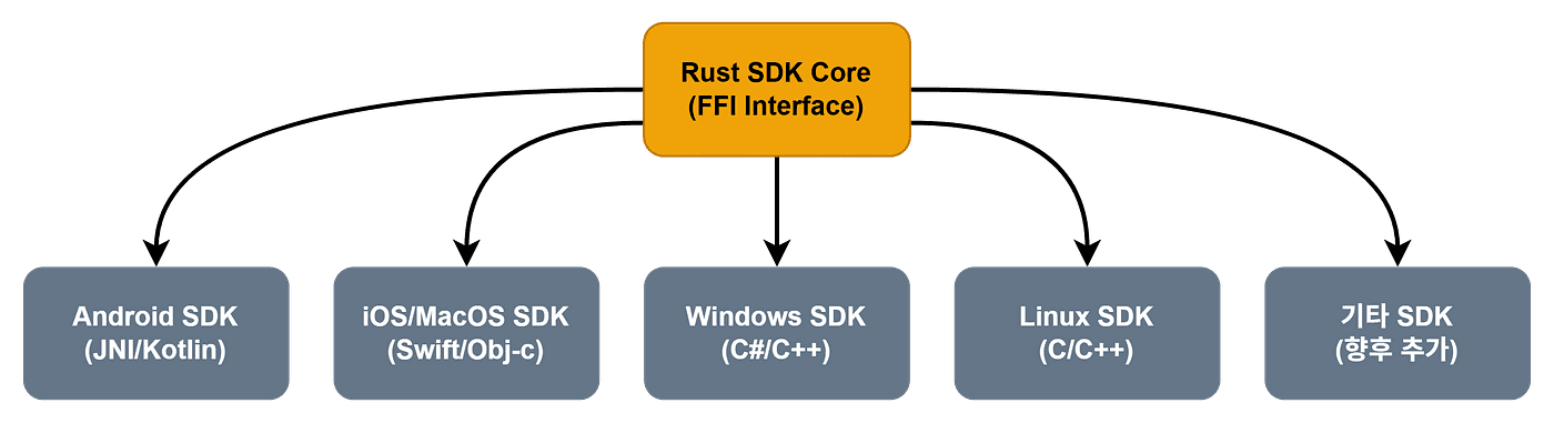 Rust가 제공하는 FFI(Foreign Function Interface)를 활용하면 작성된 SDK 코어를 공유 라이브러리(cdylib) 형태로 빌드하여 각 플랫폼의 네이티브 언어에서 직접 호출할 수 있습니다.